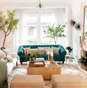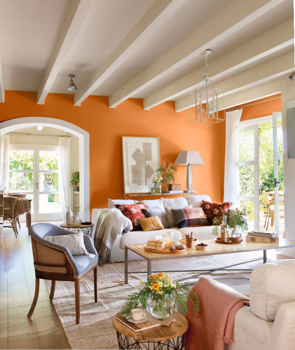 - Naranja y amarillo: los cítricos se llevan. El color naranja, en primer lugar, ofrece visualmente un impulso de energía. Destaca por su alegría y representa sobre todo la creatividad y el entusiasmo. Por ese motivo, no es recomendable para lugares de descanso como los dormitorios. Eso sí, su inspiración vitamínica es ideal para el salón, donde nos puede transmitir cada día sus buenas vibraciones. Puedes incluirlo como pintura en las paredes y optar por muebles y fundas blancas, así como complementos también luminosos. O si su intensidad es excesiva para ti, puedes incluirlo con detalles como en la ropa de hogar, en el tono de las flores, las macetas, jarrones, cuadros, etc. En cuanto al amarillo, es un tono mucho más particular y raro de ver en decoración que el naranja. Y es que al