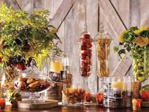 Como elementos de decoración, opta por centros de mesa –puedes hacerlos tú misma, como enseñamos en un post anterior-, por ejemplo con jarrones de cristal que contengan piñas, hojas secas, ramitas, flores secas o frescas. Y es que los elementos decorativos de cristal son ideales para esta época, ya que dejan pasar la luz, y las flores darán el toque de alegría que se necesita en esta época. Puedes incluir velas en esos centros, o farolillos encendidos encima de cómodas o en el recibidor, si te gusta darle ese detalle de evocación de otra época a tu casa.