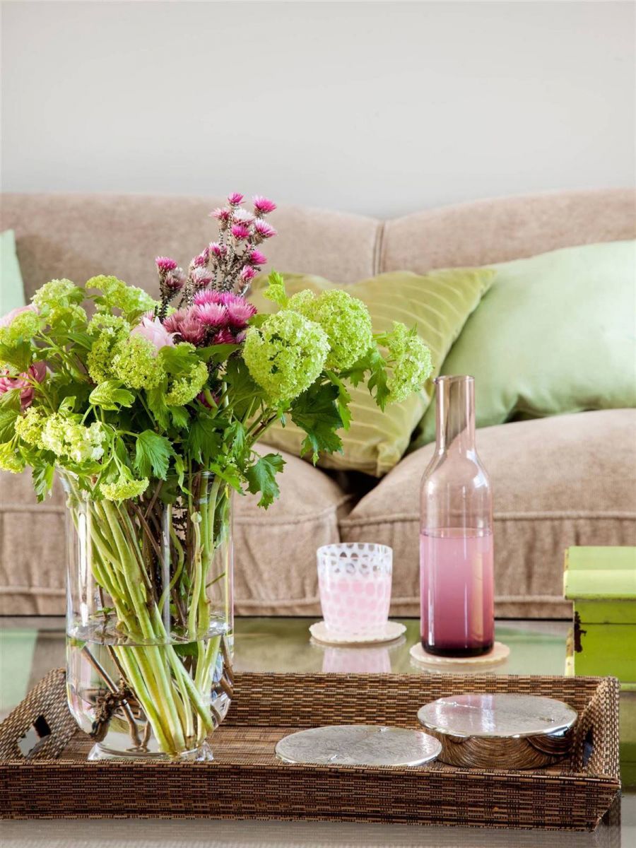 Si queremos ir más allá de lo meramente convencional, podemos reciclar objetos y hacer mesas de centro o muebles de exterior con palés, estanterías con cajas de vino pintadas, utilizar botellas de cristal como jarrones… En la imaginación está el límite. Y reusar es mejor que tirar, siempre, si se puede.