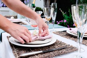 La servilletas son otra parte importante de la organización de la mesa. No solo por la elegancia que desprenden sino por la seguridad que transmiten a los invitados –una prenda que les evite las manchas en el regazo les ayudará a relajarse-, así que no las escondáis solo para las ocasiones especiales. Si se va a invertir en servilletas, mejor escoger las que son de color blanco o beige, pues os pueden sacar de un apuro, ya que combinan con todos los colores de mantelería. Un error común es ponerlas dentro de las copas o vasos. Si es una reunión familiar, colócalas a la derecha y olvida ponerlas sobre la vajilla.