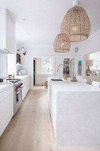 Si no te da miedo arriesgar un poco más, te recomendamos un detalle que nos encanta: añade color a tu cocina. Apuesta por un tono uniforme, por ejemplo el blanco o el topo, y aprovéchalo para añadir un color a las paredes o a los muebles de almacenaje. Crearás un estilo muy vintage. También es cada vez más común ahora incorporar una zona de office con barra en la cocina para desayunos y momentos de trabajo o de relax con la familia o amigos. El toque moderno estará garantizado si incluyes este elemento. Y como siempre recomendamos, incluye detalles y alguna parte del mobiliario –incluso lámparas para la cocina- en materiales naturales como el mimbre, el esparto o el cáñamo. Están más de moda que nunca.